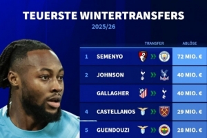 2025-26赛季冬季转会窗转会费排行:塞梅尼奥7200万欧居首