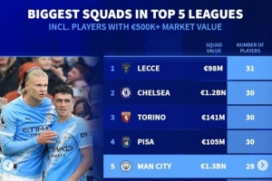 兵多将广!德转列五大联赛球队人数:切尔西30人第2 曼城29人第5