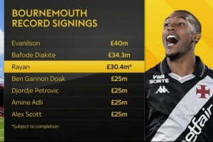 如果这笔交易最终完成,3040万镑的转会费将排在伯恩茅斯引援花费榜第三位。