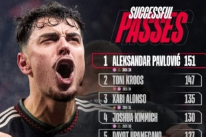 体育资讯1月23日讯 在本轮欧冠拜仁2-0击败圣吉罗斯的比赛中,帕夫洛维奇完成151次成功传球,此数据创造了拜仁球员在单场欧冠纪录,以下为具体榜单: