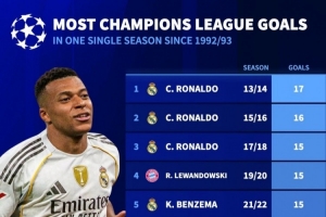 欧冠改制以来单赛季进球榜:C罗17球居首,本赛季姆巴佩13球上榜