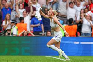 这位英格兰前锋与耐克合作已有数年,她在2022年欧洲杯夺冠后标志性的庆祝动作,将球衣举过头顶、露出白色耐克运动内衣,成为了该品牌的一个经典形象。