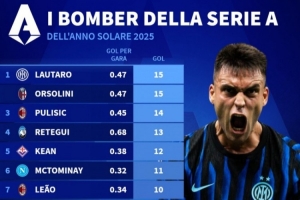 2025年意甲射手榜:劳塔罗、奥尔索里尼15球第一,普利西奇14球