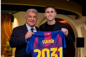 体育资讯2月6日讯 费尔明正式与巴萨签字续约,巴萨官推晒出费尔明与球队主席拉波尔塔合照,并获赠印有2031号码的纪念球衣。