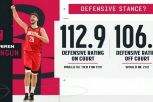 申京在场火箭防守效率(球队百回合失分)112.9,下场后为106.1