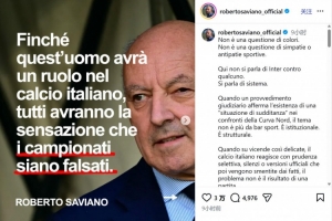 萨维亚诺对马洛塔的抨击十分直接,他甚至在 Instagram发文时配上了马洛塔的照片。身为那不勒斯死忠的萨维亚诺特意强调,自己的立场与球队无关,他说:“这不是球衣颜色的问题,也不是体育层面的好恶问题。这不是国际米兰对阵某支球队的问题,而是体系的问题。当一份司法裁定明确指出,存在某些‘受控局面’时,这件事就不再是酒吧里的闲聊话题,而是上升到了体制与结构性问题。当意大利足坛面对如此敏感的事件,却采取选择性谨慎、集体沉默,或是推出随后被事实戳穿的官方说辞时,问题就不再是一场比赛的结果。”
