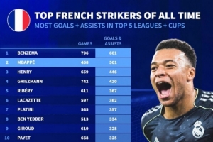 法国球员参与进球排名(五大联赛+杯赛):