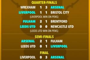 1/4决赛,阿森纳3-1淘汰雷克瑟姆,利物浦则通过点球大战击败布里斯托城,富勒姆2-1布伦特福德,利兹联则依靠点球大战淘汰纽卡晋级四强。