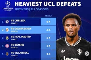 体育资讯2月18日讯 欧冠1/8决赛附加赛首回合,尤文2-5不敌加拉塔萨雷,根据德转统计,本场是尤文在欧冠的第二大惨败,也是首次单场丢5球。
