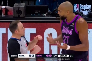 GIF-戈贝尔和巴格利篮下纠缠,裁判先吹戈贝尔技犯,随后双方技犯,回放后升级为戈贝尔一级恶意犯规