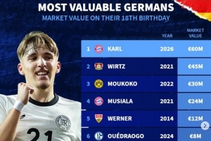 德国18岁球员身价榜:卡尔居首,维尔茨、穆科科、穆西亚拉列前四