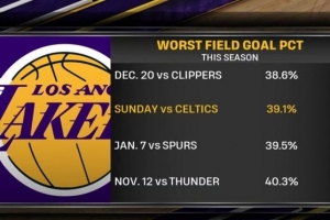 湖人今天惨败凯尔特人,全队命中率仅39.1%,赛季倒数第二低。