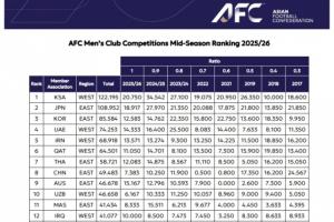 亚足联俱乐部赛事中期排行:沙特联居首 中超第八仅领先澳超2.8分