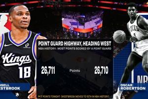 比赛第四节,国王后卫拉塞尔·威斯布鲁克突破上篮得手,得到本场比赛第17分,个人生涯总得分来到26711,超越奥斯卡·罗伯特森(26710)升至NBA历史得分排行榜第15位,成为NBA历史控卫得分王!