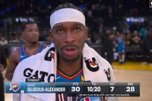 本场比赛,亚历山大三节打卡,他出战28分钟,投篮20中10,三分球5中3,罚球7中7,拿到30分1篮板7助攻。